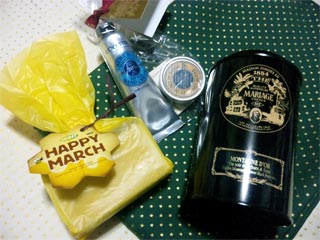 LUSHのみつばちマーチ(石けん)、ロクシタンのハンドクリーム&シアバターのセット、マリアージュ フレールのモンターニュ ドール(紅茶)